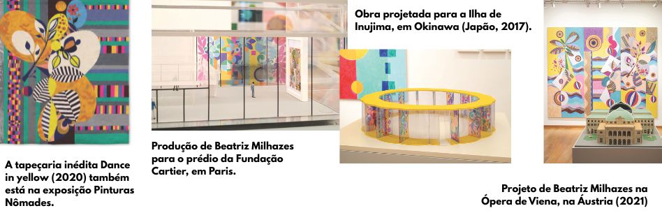 O nome Beatriz tem origem latina – do latim Beatrix – que significa “a que faz bem”, “a que traz felicidade”. Essa etimologia não é mero detalhe, mas ressoa de maneira simbólica com o trabalho da artista, cuja obra inspira alegria, festividade visual, brilho, cor e padrões que celebram a vida. Em Pinturas Nômades, essa luminosidade não está apenas nas cores, mas emerge na escala monumental, no encontro entre o espaço arquitetônico e a obra, no jogo de luz e sombra, na transparência dos materiais. A exposição convida o público a experimentar uma sensação de felicidade estética, estimulada tanto pelas formas visuais quanto pela própria experiência de entrar num espaço transformado pela arte.